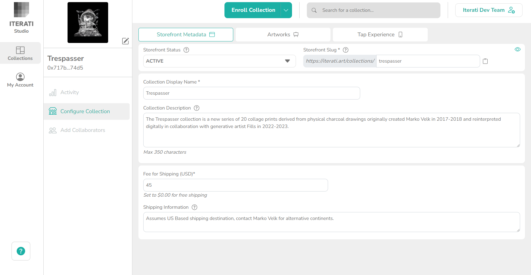 `Fee For Shipping`` `<mark style="color:red;">`*`</mark> - Input a collection wide shipping fee in USD that gets added to the order total for any purchased artwork. *If this field is greyed out you will need to first* [*connect your bank account.*](https://docs.iterati.art/getting-started/connect-your-bank-account-and-get-paid)